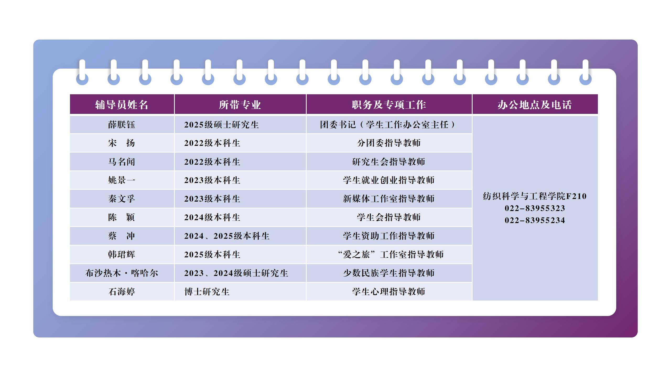 纺织科学与工程学院团委是学院党委对团员青年进行教育、管理和服务的有力助手,是学院团委建设和团工作的核心。负责团的组织建设、学生思想政治引导、校园文化建设和学生成才服务等工作。以“严谨、严格、求实、求是”校训为指导,务实求真,开拓进取,合理规划,认真探索,积极实践,统揽纺织科学与工程学院共青团工作全局,进而实现共青团组织的可持续和跨越式发展。